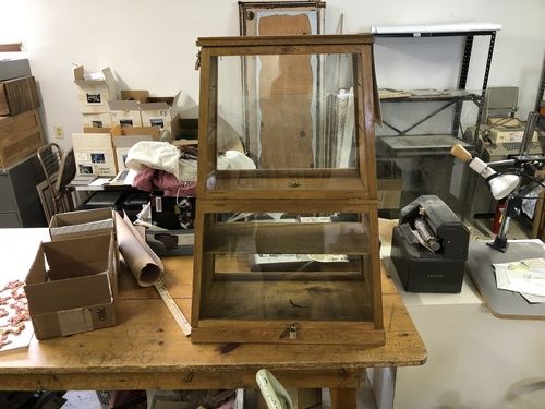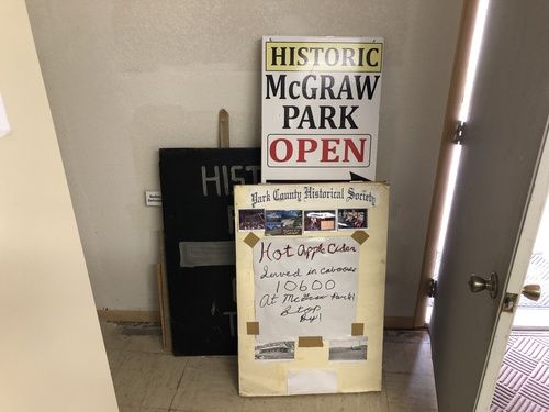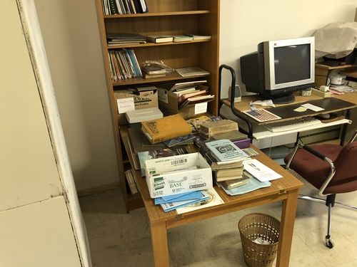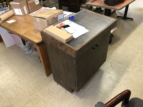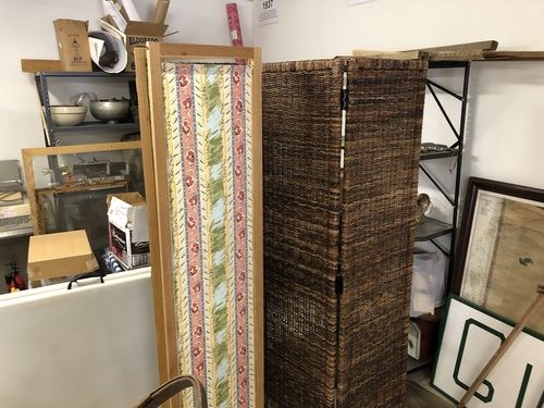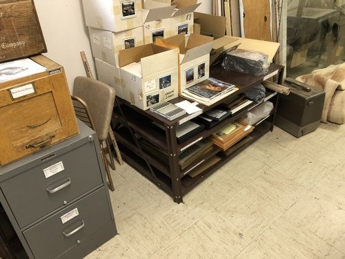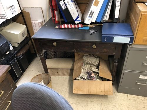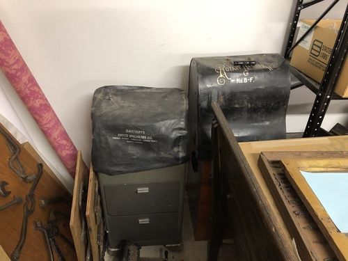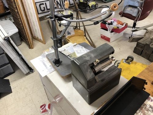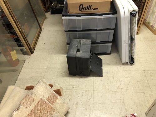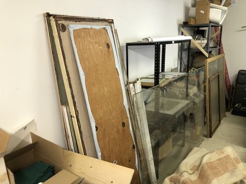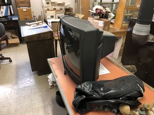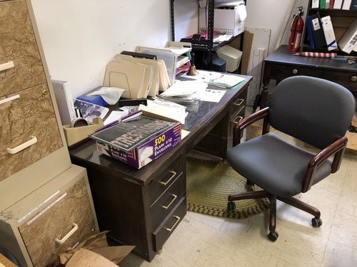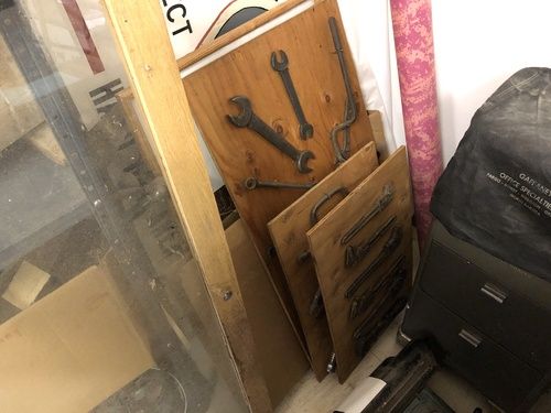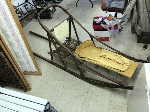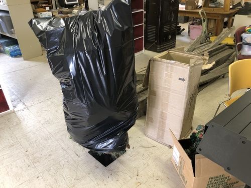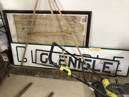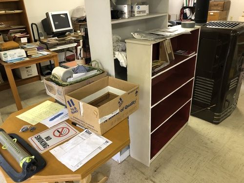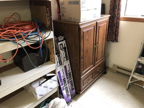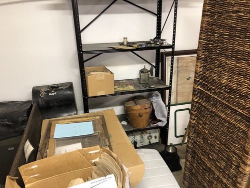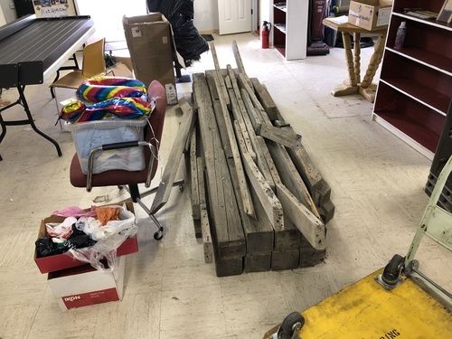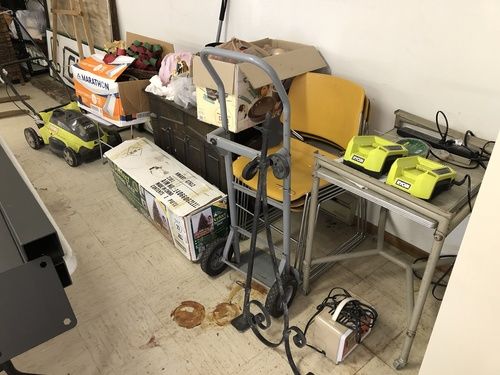 Sign arm - attic; lawnmower- if not working -trash; donated clothes - return to donor or trash; dolly - tool shed; cast iron stove - relocate to building, sell, donate, or trash; chairs - donate or trash; small heater - tool shed or stored in cabinet; small grey table - trash.
