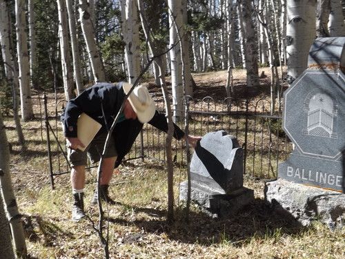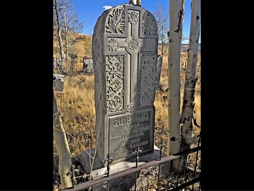 From Como, we drove to Fairplay for lunch. After we ate, we drove to the Fairplay cemetery north of town. Laura and Christie guided us through known Fairplay burials of town inhabitants of the past, including the Teter family, the namesake for the Edith Teter Elementary school in town, built in 1874. We also observed the graves moved from the town of Montgomery in 1953, to prepare to build the reservoir, now there. We also found the headstone of Marie Guiraud, the founder/rancher/entrepreneur of the town of Garo's, who dies in 1909. Another headstone we found was of Doc Bell, who was well known in the county. We tried to find the headstone of Johnny Hoover, hung from the top floor of the Park Count Courthouse in 1880, but weren't able to.