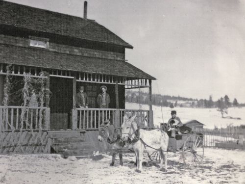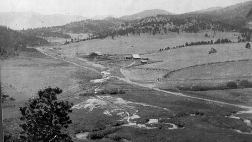 In addition to recreation, land was rented to individuals for agricultural purposes, such as ranching. This photograph shows the original location of the Deer Valley Park Association Ranch. It's original location is in the area of the new building, Deer Creek Corners, and the Bailey area Park County Library. Notice that the landscape has several buildings, such as the ranch house and barn, as well as corrals.