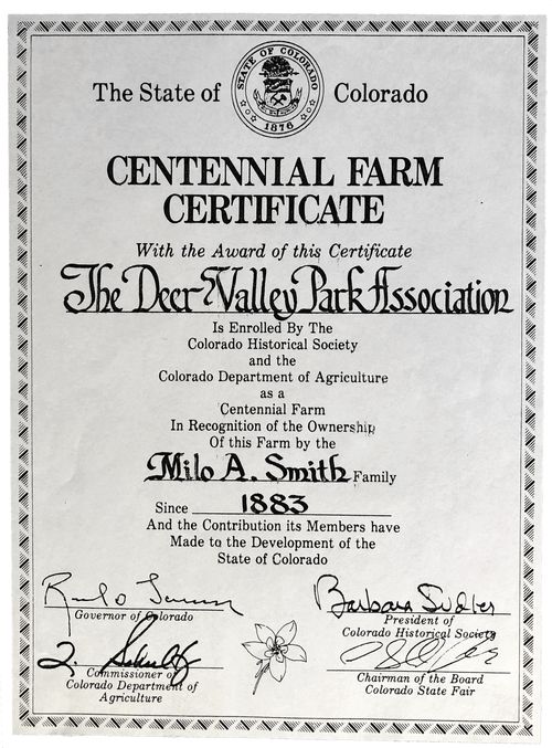 The Deer Valley Park Association was awarded this certificate of recognition in 1986. The Centennial Farm Certificate honors ranches and farms that have been in the same family for more than 100 years.