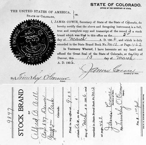 This brand, used by the Deer Valley Park Association Ranch, was registered with the state of Colorado in March of 1906. However, the brand was used long before it was registered.
