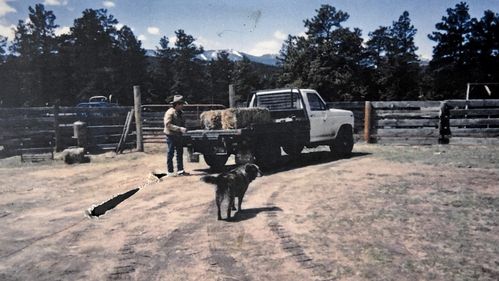 Machines assist the rancher today with work. John Woodward uses his truck to haul hay to the cattle during winter and spring feeding.