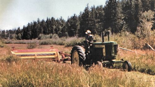 At harvest time the swather is the first piece of machinery on the field. This machine cuts the grass like a lawn mower.