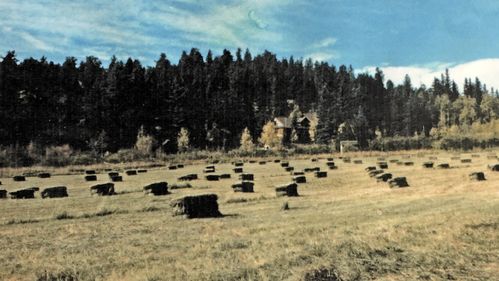 As we take a closer look at the original ranch's landscape we see the ranch house along with several sheds.