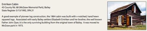 Elizabeth Entriken was well known for her generosity and hospitality. She knew and entertained famous prospectors, millionaires, writers, and builders. Howard and Augusta Tabor, John Evans, William Byers, Chief Colorow, and John Chivington were among those who experienced her hospitality. In addition, stagecoach passengers often stopped at the cabin for meals in the 1870s. Elizabeth Entriken lived in the cabin from 1864 until shortly before her death in 1922. The Entriken Cabin is the only remaining structure from the original town of Bailey. It was originally located at the mouth of Entriken Gulch near the Forest Ranger Station on Main Street. It was moved to its present location in 1973.