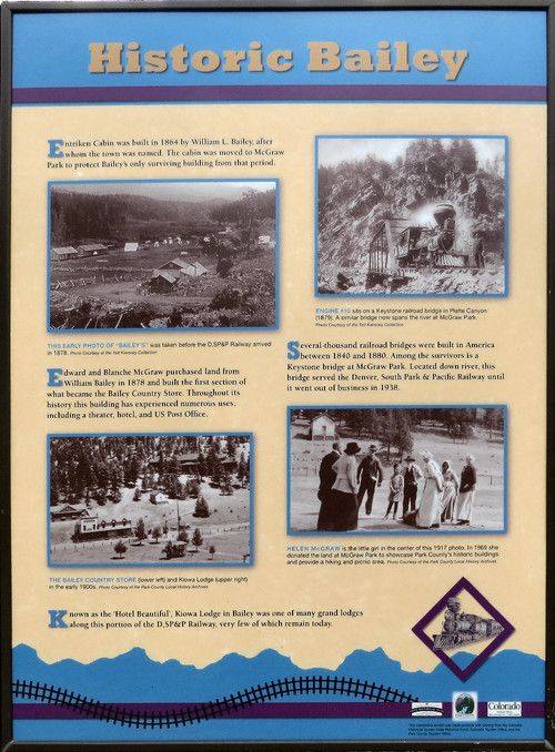 Edward and Blanche McGraw came to the Bailey area in the 1870s and opened the first grocery store, the Bailey Country Store, (now, the Sasquatch Outpost) on Main Street. In 1969 their granddaughter, Helen McGraw Tatum, who was born in Bailey and lived here many years, donated the land for this Park to the Park County Historical Society. The Park is for public enjoyment and historical information about the area.